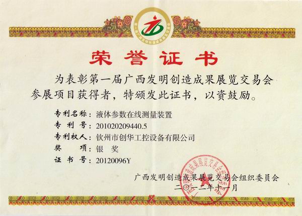 2012年12月我公司喜獲由廣西發(fā)明創(chuàng)造成果展覽交易會組織委員會頒發(fā)的“廣西發(fā)明創(chuàng)造獎銀獎”。 我公司榮獲參展獎項:液體參數(shù)在線測量裝置,該測量裝置配套到pH自控系統(tǒng),將提高測量的準(zhǔn)確性,保證系統(tǒng)的穩(wěn)定性,整體結(jié)構(gòu)簡單可靠、一目了然,克服以往裝置結(jié)構(gòu)復(fù)雜、故障率高、維護(hù)量大等缺點。