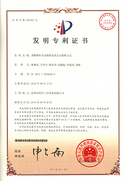 2014年8月20日,我公司自主研發(fā)的“煮糖物料在線稀釋系統(tǒng)”榮獲國家發(fā)明專利授權。截止目前,我公司已獲國家發(fā)明專利授權3項,實用專利授權5項。