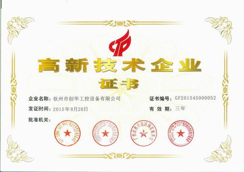欽州市創(chuàng)華工控設(shè)備有限公司順利通過廣西壯族自治區(qū)2015年第一批高新技術(shù)企業(yè)復(fù)審。